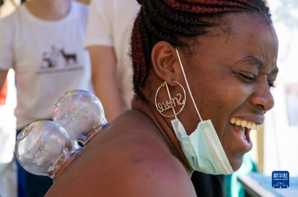 4月22日,在纳米比亚首都温得和克,一名女子在“中文:共筑美好未来”主题活动上体验中医药。