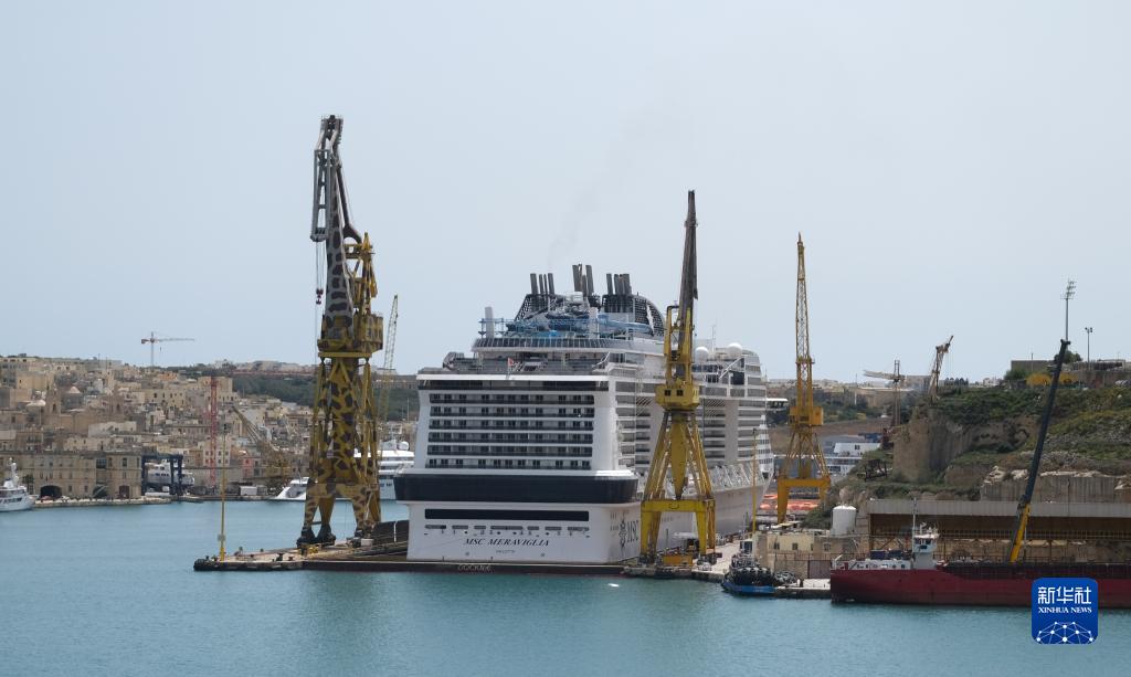 4月22日,在马耳他瓦莱塔,一艘大型邮轮在6号干船坞进行维修。