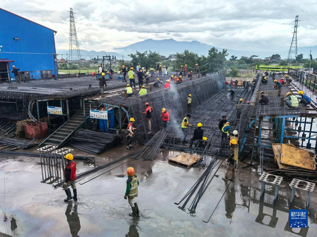 5月1日,工人在印度尼西亚雅万高铁4号梁场作业。