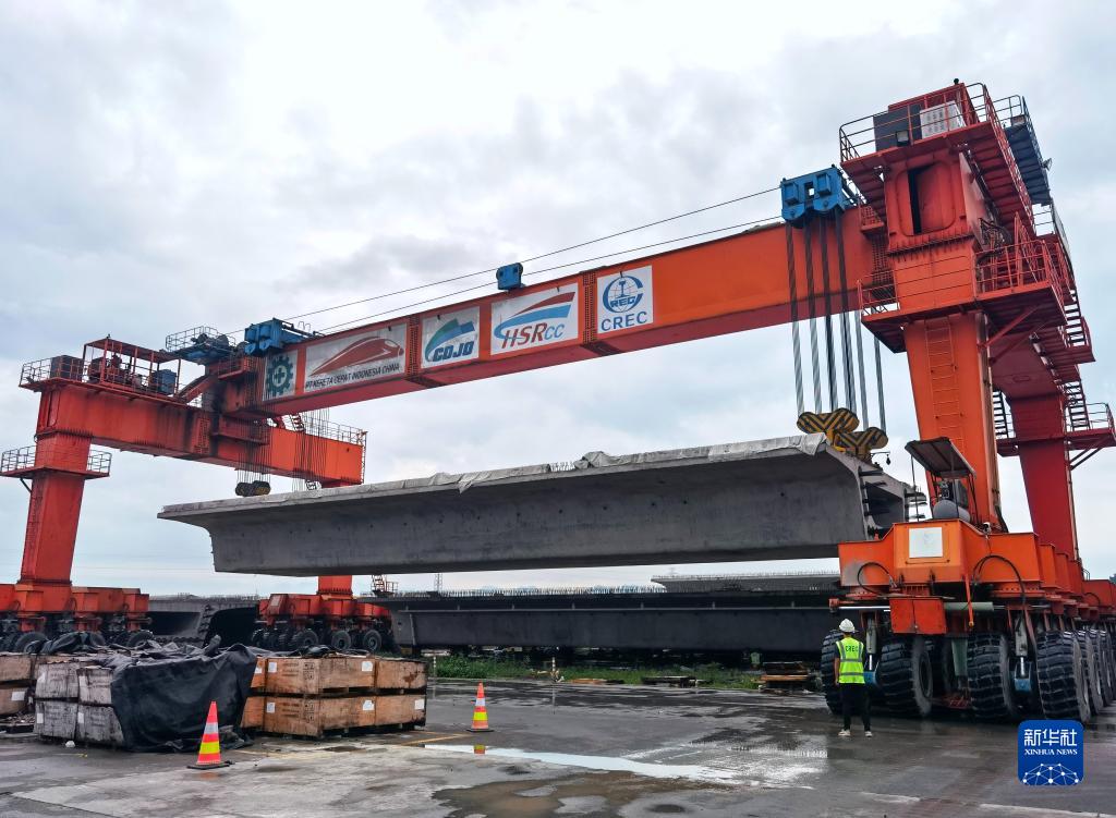 5月1日,工人在印度尼西亚雅万高铁4号梁场进行提梁作业。