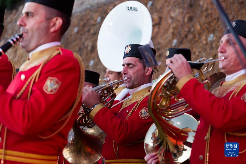 7月13日,在黑山首都波德戈里察,身着传统服饰的乐手在黑山南北高速公路优先段通车仪式上演奏。