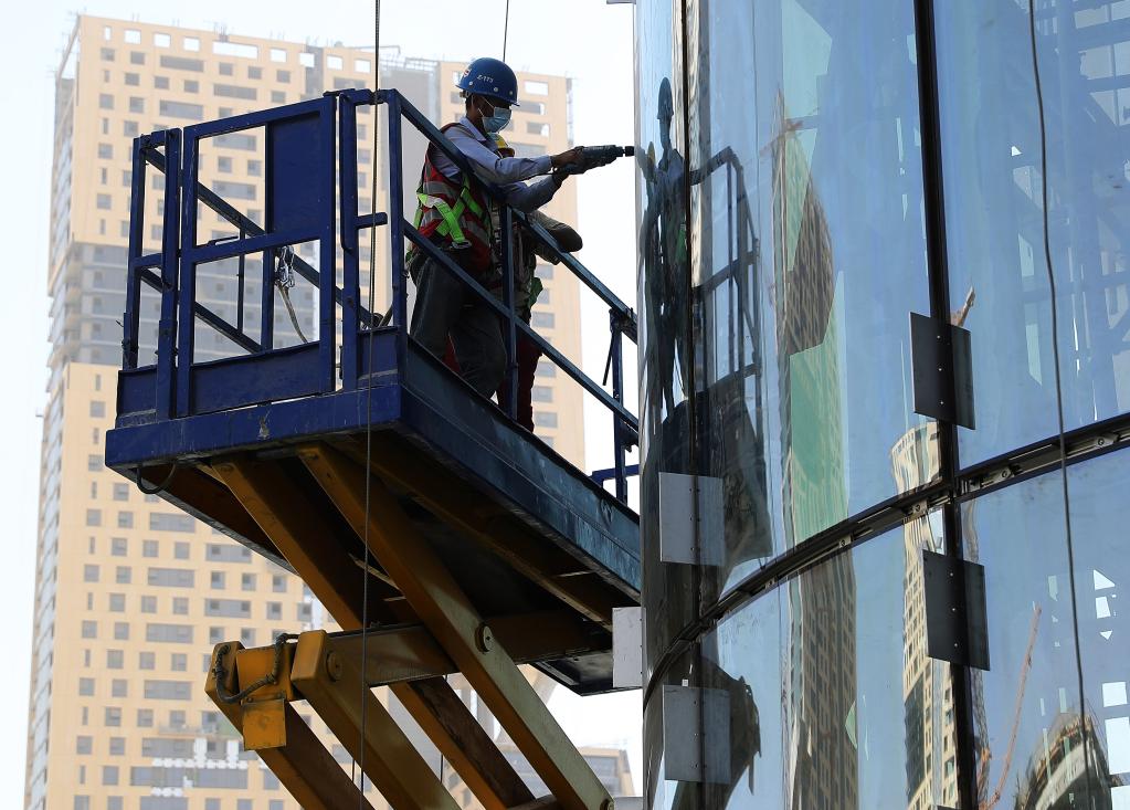 8月17日,工人在埃及新行政首都中央商务区项目现场施工。新华社记者王东震摄