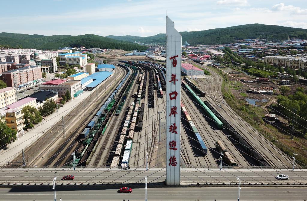 这是2022年6月8日拍摄的绥芬河站南场,中欧班列从这里出入境(无人机照片)。新华社记者王建威 摄
