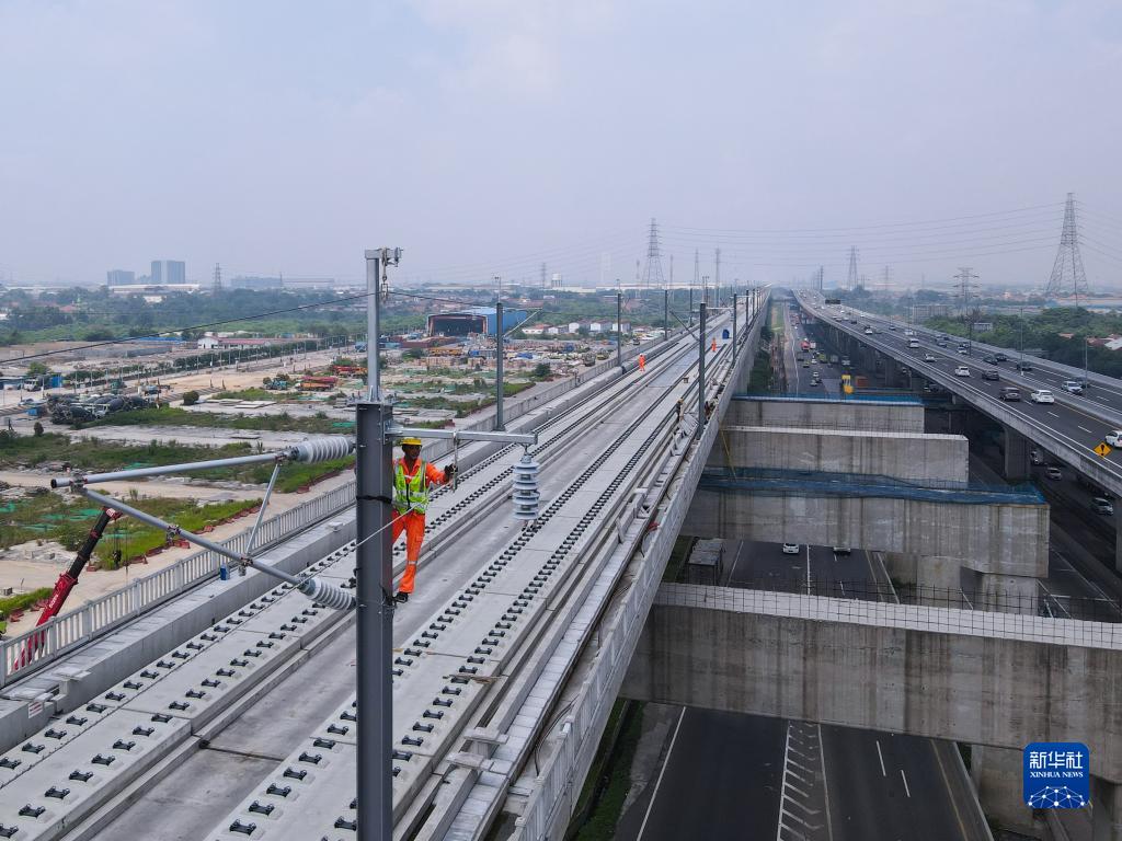 1月21日,在印度尼西亚勿加泗雅万高铁沿线,中铁电气化局印尼雅万高铁项目部施工人员进行高铁接触网附加线架设工作(无人机照片)。