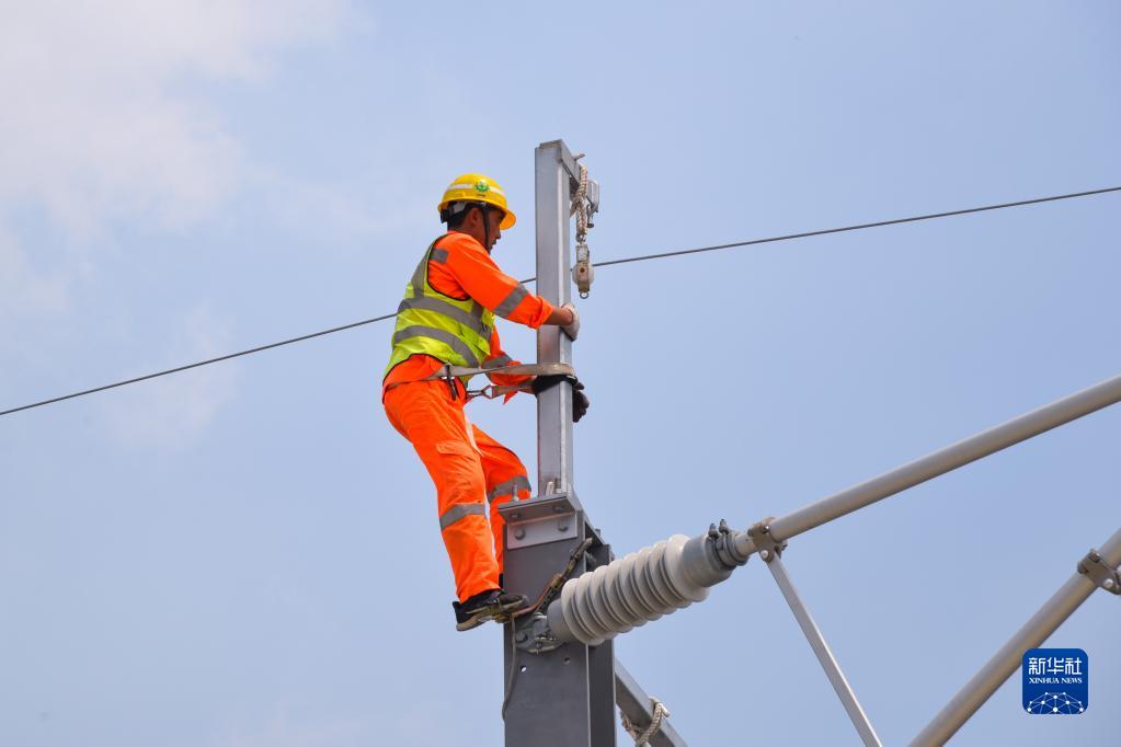 1月21日,在印度尼西亚勿加泗雅万高铁沿线,中铁电气化局印尼雅万高铁项目部施工人员进行高铁接触网附加线架设工作。