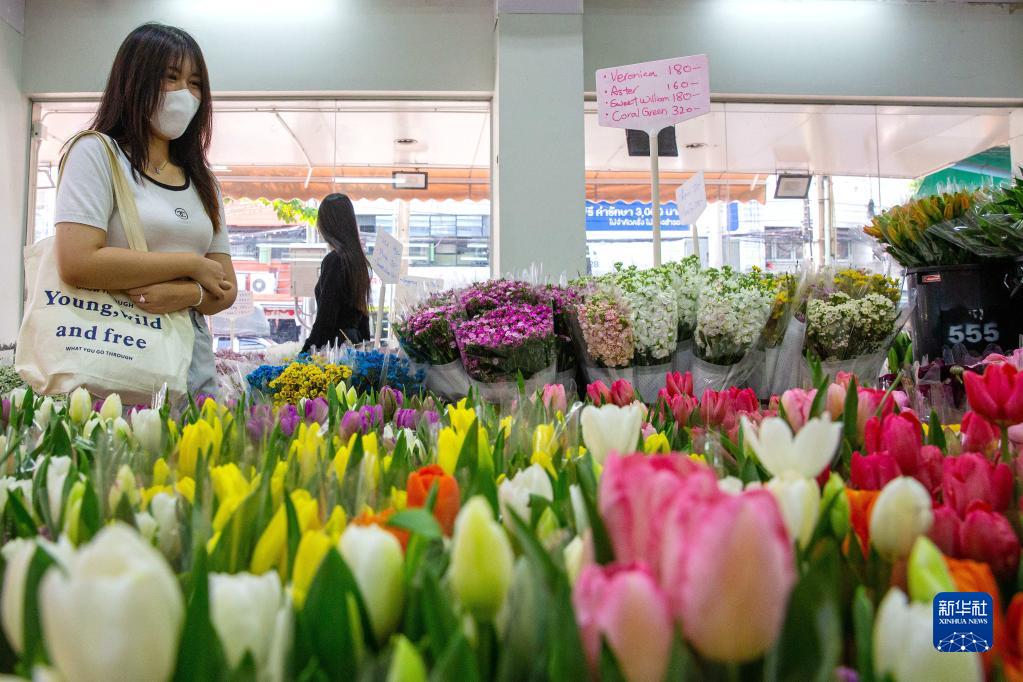 2月21日,顾客在泰国曼谷帕空鲜花市场挑选来自云南的鲜花。