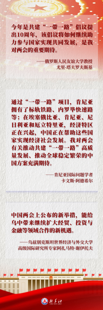 “毫无疑问,中国式现代化道路为所有渴望实现经济社会发展的发展中国家提供了启迪。”巴西圣保罗州立大学中国问题专家路易斯·保利诺说,世界正在经历一个极其困难的时刻,“希望中国两会推出的一系列新举措不仅能让中国朝着其发展目标稳步前进,也能继续为各国发展以及建立更加公正、公平的全球秩序提供借鉴、作出贡献”。(综合新华社驻外记者报道,执笔记者:常天童、杨威、齐紫剑、韩梁、谢彬彬、杨天沐、何毅)