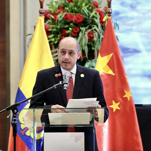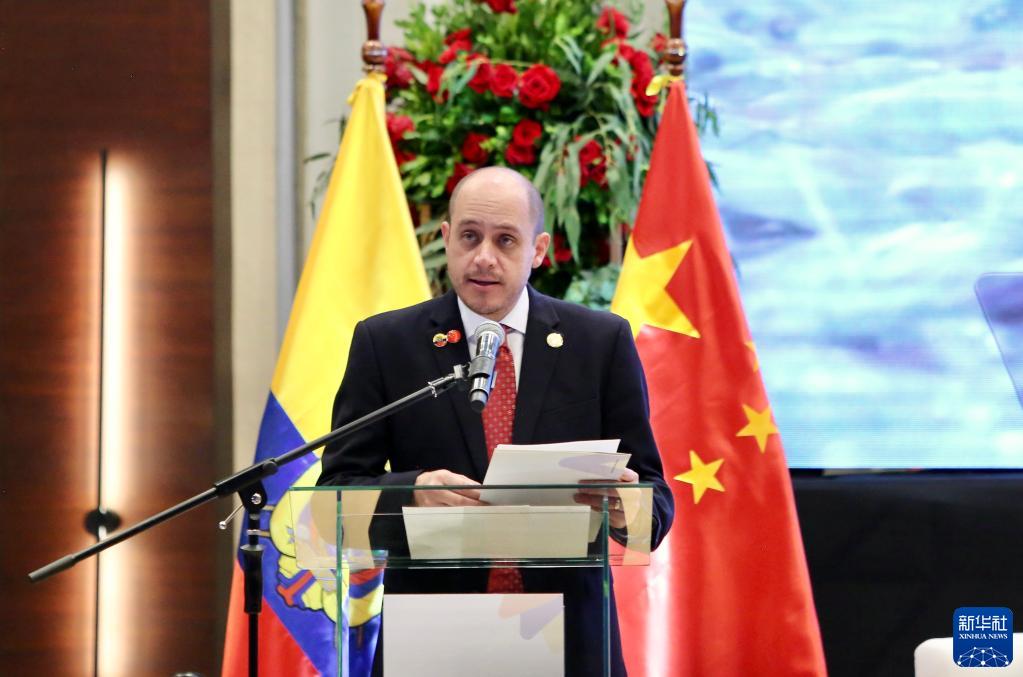 5月10日,厄瓜多尔生产、外贸、投资和渔业部部长普拉多在厄瓜多尔基多举行的中厄签署自贸协定相关活动上致辞。