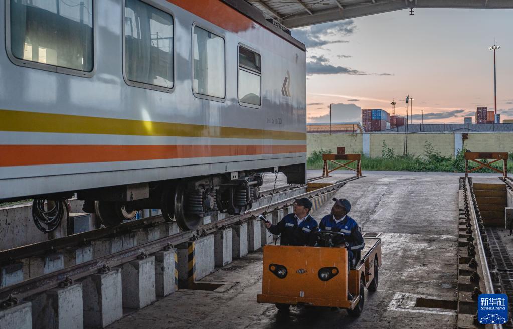 5月23日,在肯尼亚内罗毕,吴同明(左)与学员基鲁姆瓦在车辆运用车间检查客运车厢。