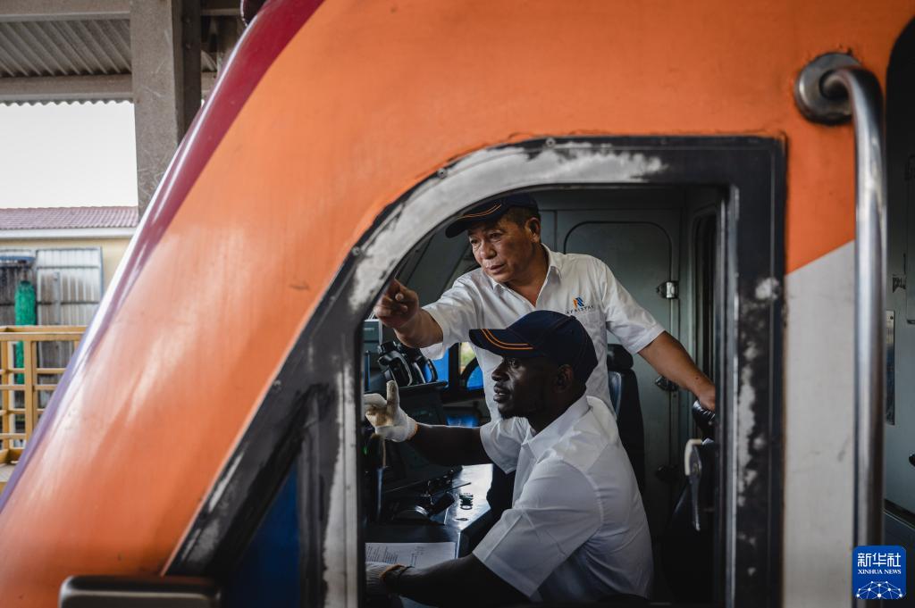 5月23日,在肯尼亚内罗毕,蒋立平(后)与学员霍勒斯进行机车检查。