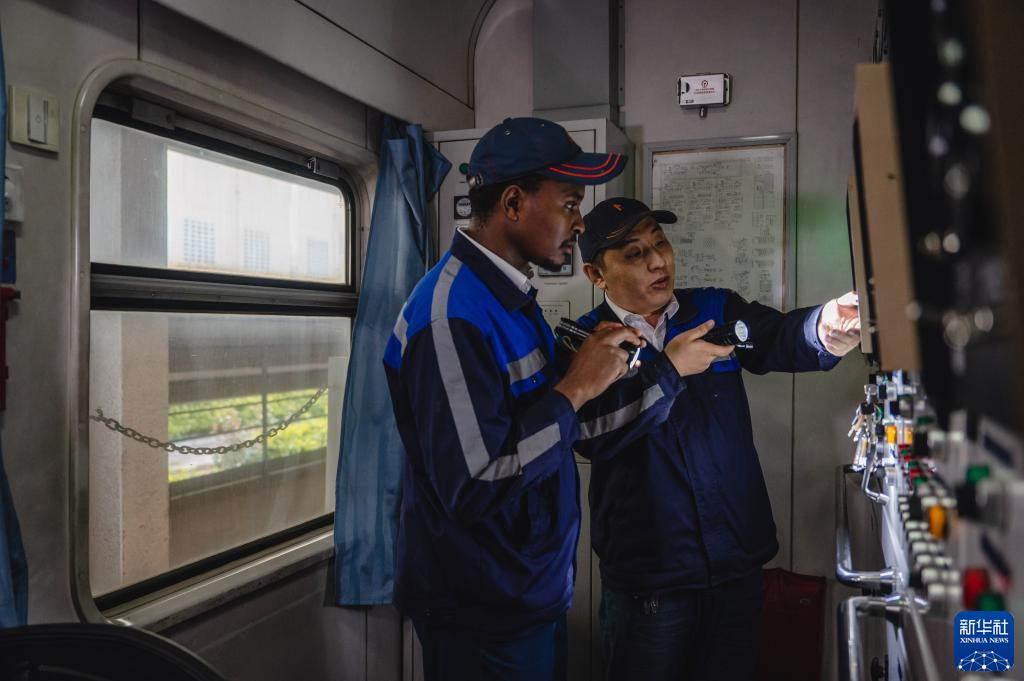 5月23日,在肯尼亚内罗毕,吴同明(右)与学员基鲁姆瓦在车辆运用车间检查发电车。