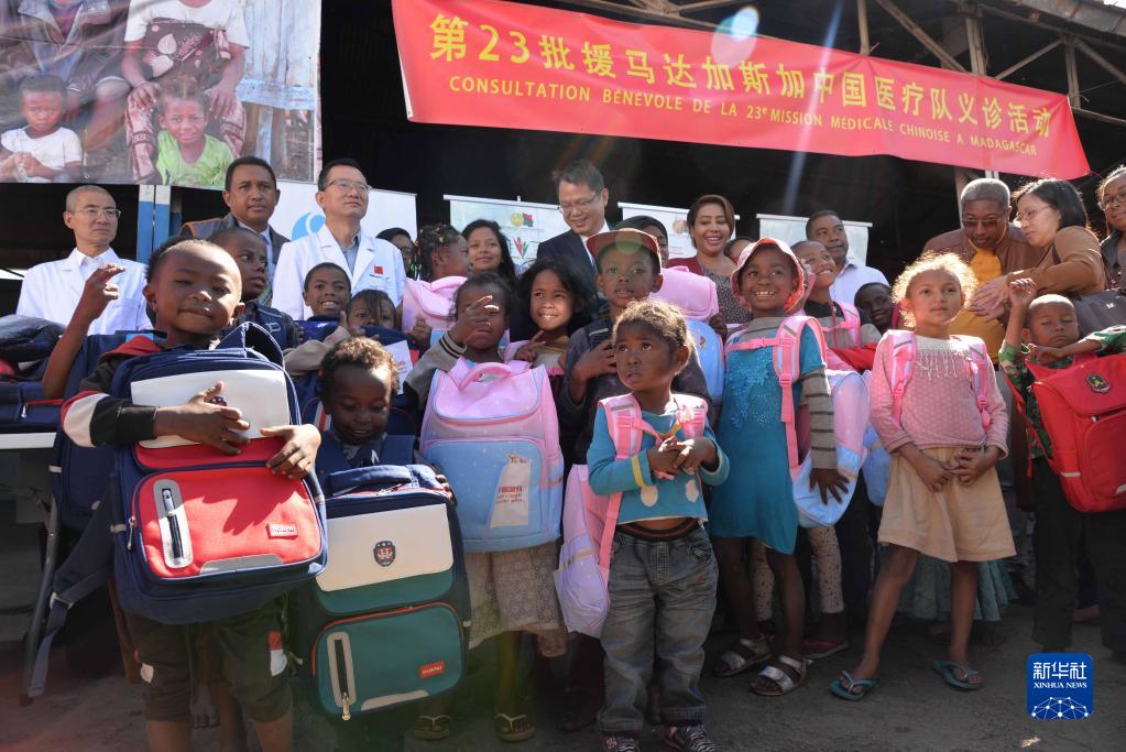 在马达加斯加首都塔那那利佛一所社会福利机构举行的活动中,中马两国人士一同向福利机构儿童分发了装有健康用品、文具、食品、衣物等物资的爱心包,中国援马医疗队为福利机构的妇女儿童进行了义诊。中国驻马大使馆还向福利机构捐赠了食品、床垫、卫生用品等生活物资。参加活动的孩子们背上崭新的书包,脸上洋溢着幸福的笑容,齐声歌唱表达感恩之情。