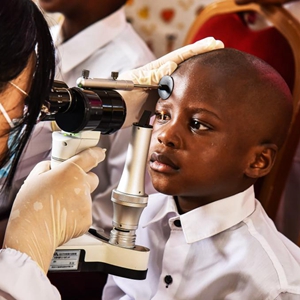 5月26日,在喀麦隆首都雅温得,中国第22批援喀医疗队的眼科大夫为“孩子为重”孤儿中心的儿童检查眼睛。新华社发(科普索摄)