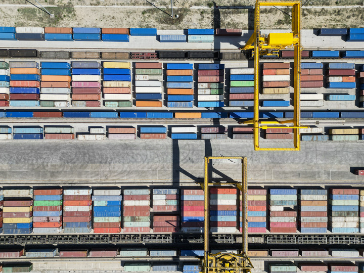在新疆霍尔果斯铁路口岸,换装场内在进行班列换装作业(无人机照片)。新华社记者 郝昭 摄