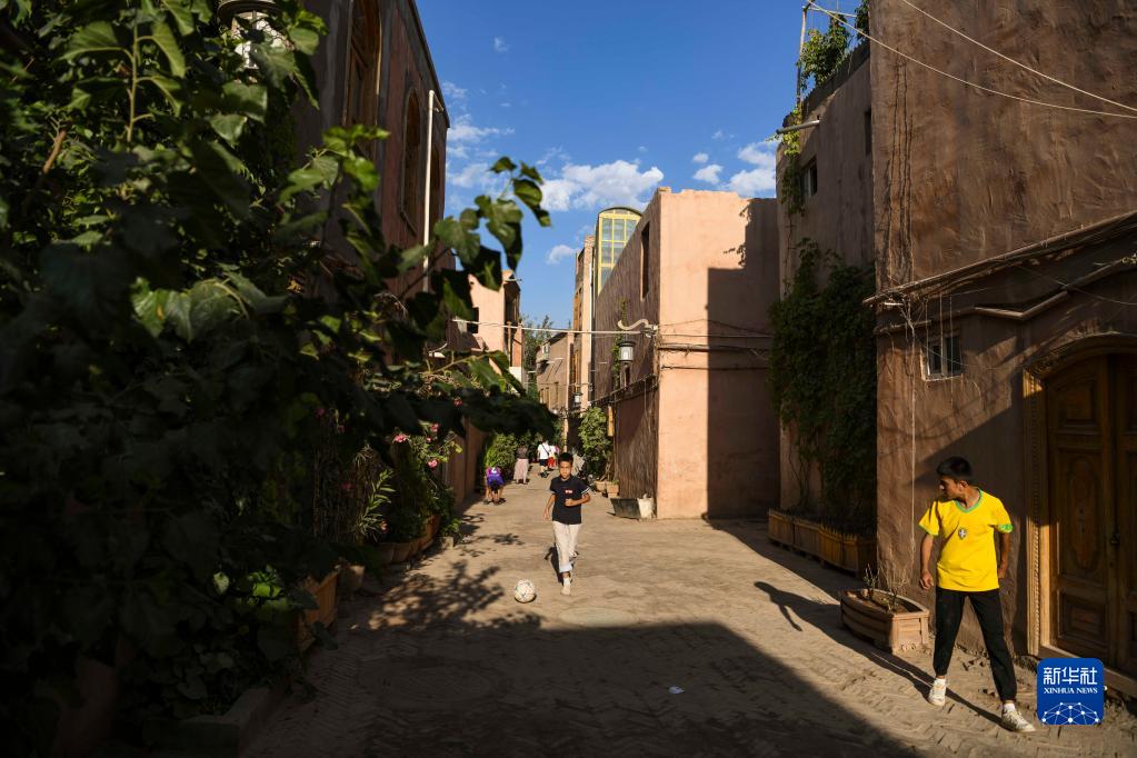 小朋友在新疆喀什古城景区的小巷内踢球(6月15日摄)。新华社记者 胡虎虎 摄