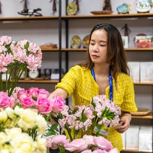 7月1日,在湖南高桥大市场,博览会常设展馆展区肯尼亚馆馆长黄梓楠在整理产自非洲的鲜花。新华社记者 陈思汗 摄