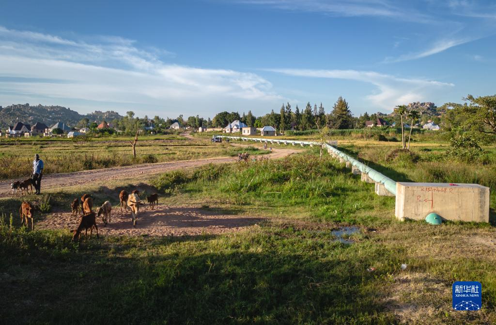 这是6月11日在坦桑尼亚姆万扎省萨哈一处沼泽地拍摄的供水项目输水管道(无人机照片)。
