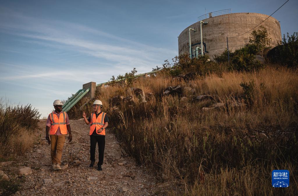 6月12日,凯尔文(左)在坦桑尼亚姆万扎省布斯韦卢供水项目高位蓄水池旁与同事交流。