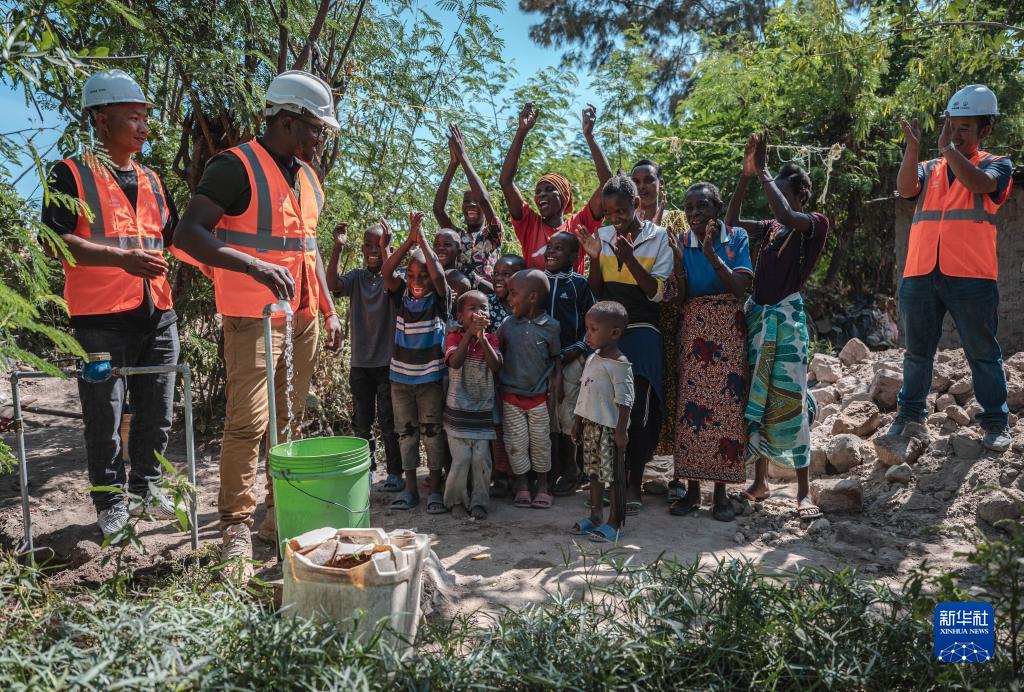 6月13日,在坦桑尼亚姆万扎省米松圭,凯尔文(左二)与同事接通水管后赢得当地居民鼓掌欢呼。