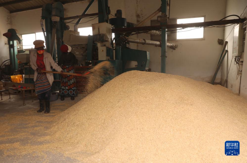 7月25日,在莫桑比克马普托省博阿内地区,工人在中莫农业技术示范中心加工水稻。