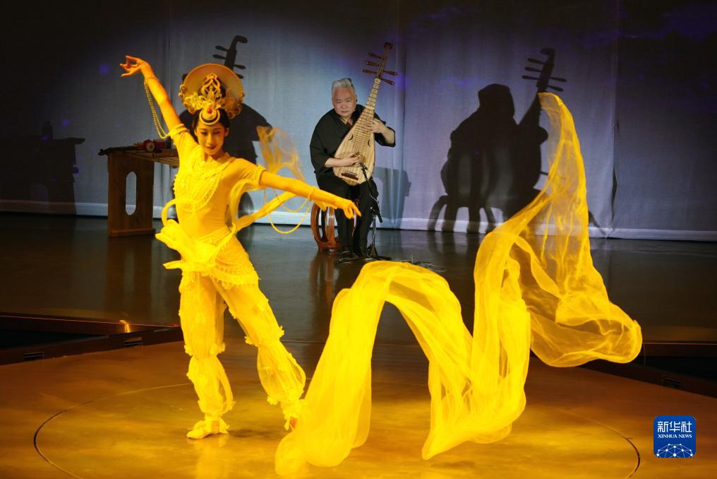 8月9日,在《乐动敦煌》演出现场,敦煌古乐全球推广大使、国乐艺术家方锦龙演奏琵琶,为舞蹈演员伴奏。