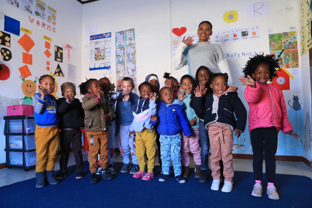 8月11日,老师与孩子们在南非德阿镇的一家儿童早教中心合影。这家早教中心由中国龙源南非公司出资成立运营。(新华社记者董江辉摄)