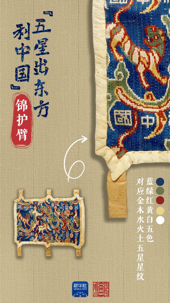 1995年,新疆考古工作者在和田地区民丰县尼雅遗址一处古墓中发掘出土了一件长18.5厘米、宽12.5厘米的锦护臂。织锦图案用云气纹作骨架,沿纬向由右至左连续铺展,凤凰、鸾鸟、麒麟、白虎等瑞兽和祥云瑞草,将“五星出东方利中国”的文字巧妙环绕,表达了祈佑祥瑞的寓意。“2000多年前,汉代织锦就已经出现在了新疆,实证了汉朝治理西域的历史事实,也是古丝绸之路开拓与发展、中原同西域文化交融的有力佐证。”新疆维吾尔自治区博物馆文博副研究馆员孙维国说。“五星出东方利中国”锦护臂出土后备受世人瞩目,并被列入首批64件禁止出国(境)展览的文物。