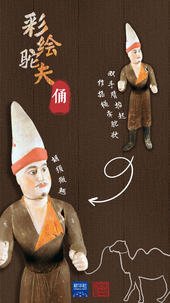 吐鲁番阿斯塔那206号墓是唐代高昌左卫大将军张雄与妻子的合葬墓。墓中出土的木俑做工精湛,大多是由中原生产,具有明显的盛唐风格,彩绘驼夫俑便出土于此。驼夫为胡人男子形象,深目高鼻,胡须微翘,头戴高耸折沿白毡尖帽,身着褐色掩襟长袍,足穿高棱黑靴。此俑为分段雕刻胶合而成,再施以彩绘,面部表情富有神韵,惟妙惟肖。通过驼夫生动的神情仿佛看到他牵着骆驼,带着各色商品,沿着丝绸之路慢慢走来。