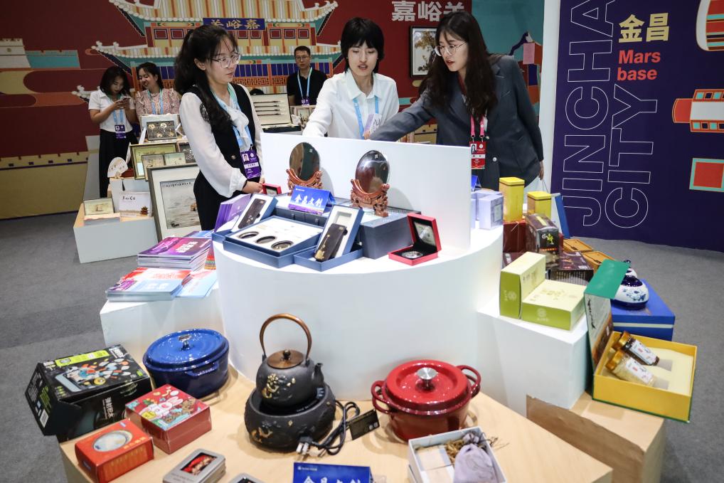 9月6日,与会嘉宾在第六届丝绸之路(敦煌)国际文化博览会上参观文创产品和文旅装备展销活动。新华社记者 马希平 摄