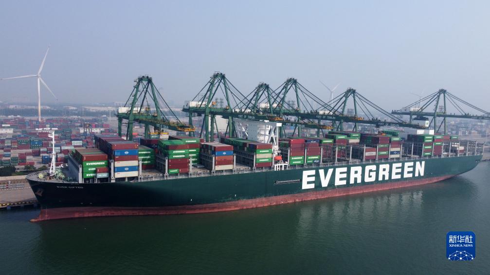9月18日,一艘货轮在天津港太平洋国际集装箱码头进行装卸作业(无人机照片)。