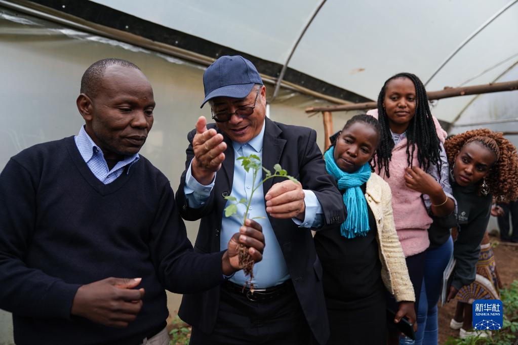 9月18日,在肯尼亚纳库鲁郡马坦吉提萨村,来自中国的农学教授刘高琼(左二)为肯方学员指导农业技术。