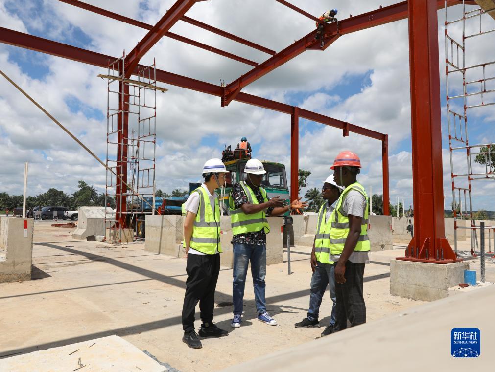 9月20日,中国工程师王蒋明(左一)与尼日利亚工程师蒂贾尼 (左二)在尼日利亚凯菲路一期工程收费站建设工地检查工程质量。