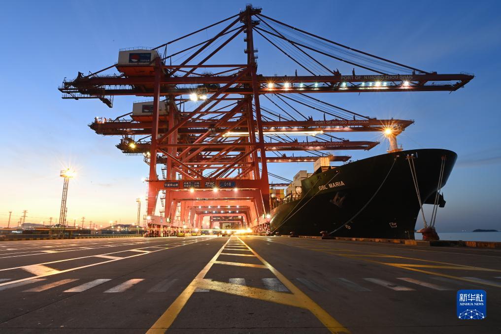 一艘货轮停靠在宁波舟山港穿山港区集装箱码头(2023年1月31日摄)。