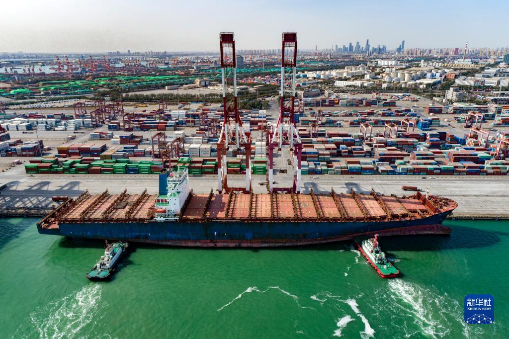 一艘货轮停靠天津港(2020年10月27日摄,无人机照片)。