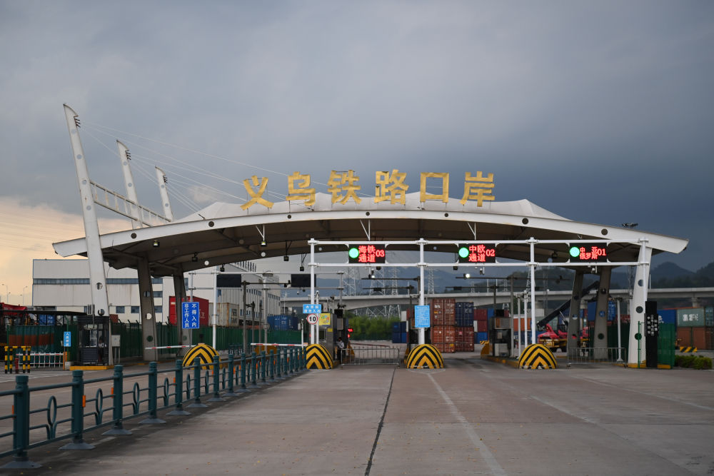 ↑义乌铁路西站拍摄的中欧班列(义乌-马德里)始发港标识