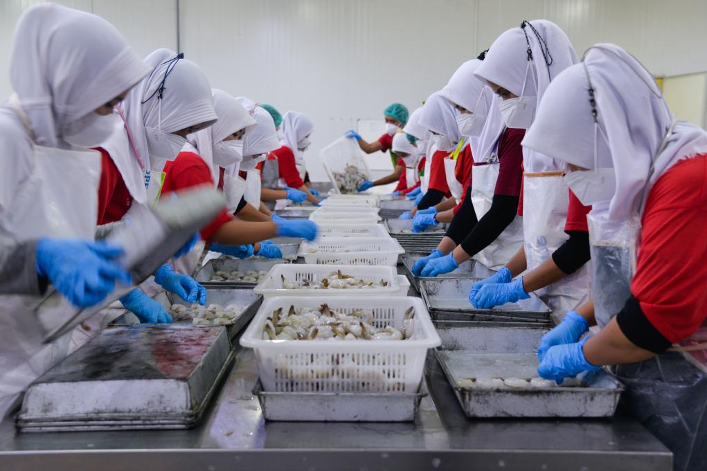 2023年8月29日,在印度尼西亚中爪哇省三宝垄市,工人在福建淼天汇食品有限公司印尼公司的对虾加工生产线上工作。新华社记者 徐钦 摄