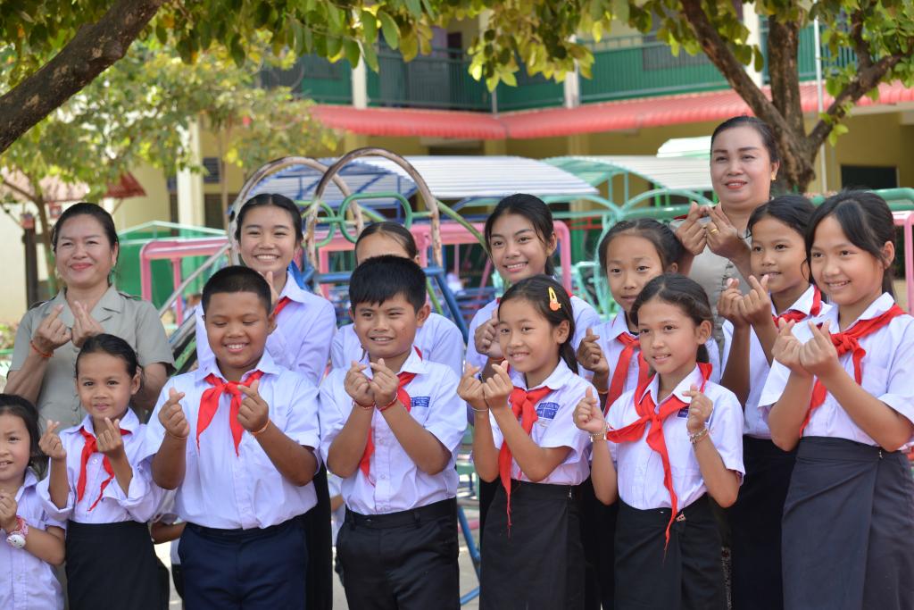 在采访中,中老友好农冰村小学师生为老中友谊“比心”。