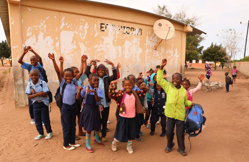 7月25日,莫桑比克马普托省皮科科村学校的孩子们站在装有中国援助的卫星电视接收天线的房屋前。