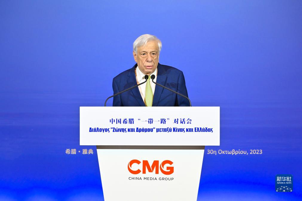 10月30日,希腊前总统帕夫洛普洛斯在雅典举行的“山海相通 中希辉映:中国希腊‘一带一路’对话会”上致辞。新华社发