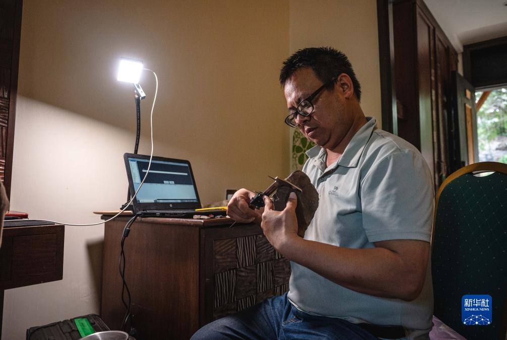 11月3日,中肯联合考古队队员顾雪军在位于肯尼亚巴林戈郡马里加特镇的临时驻地内进行测量工作。