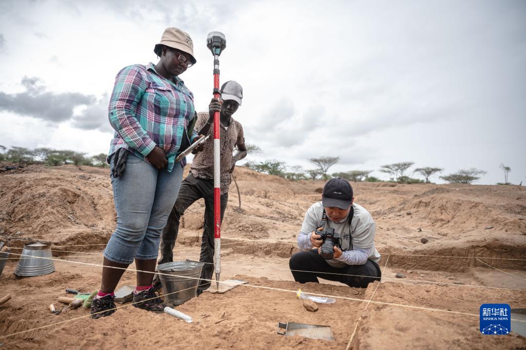 11月3日,中肯联合考古队队员娄文台(右)在位于肯尼亚巴林戈郡马里加特镇的考古现场拍摄发掘出的石器。