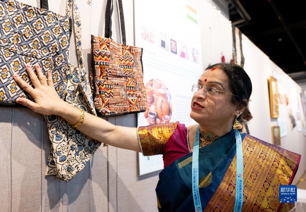 12月9日,来自印度的艺术家拉达在介绍自己的编织包。