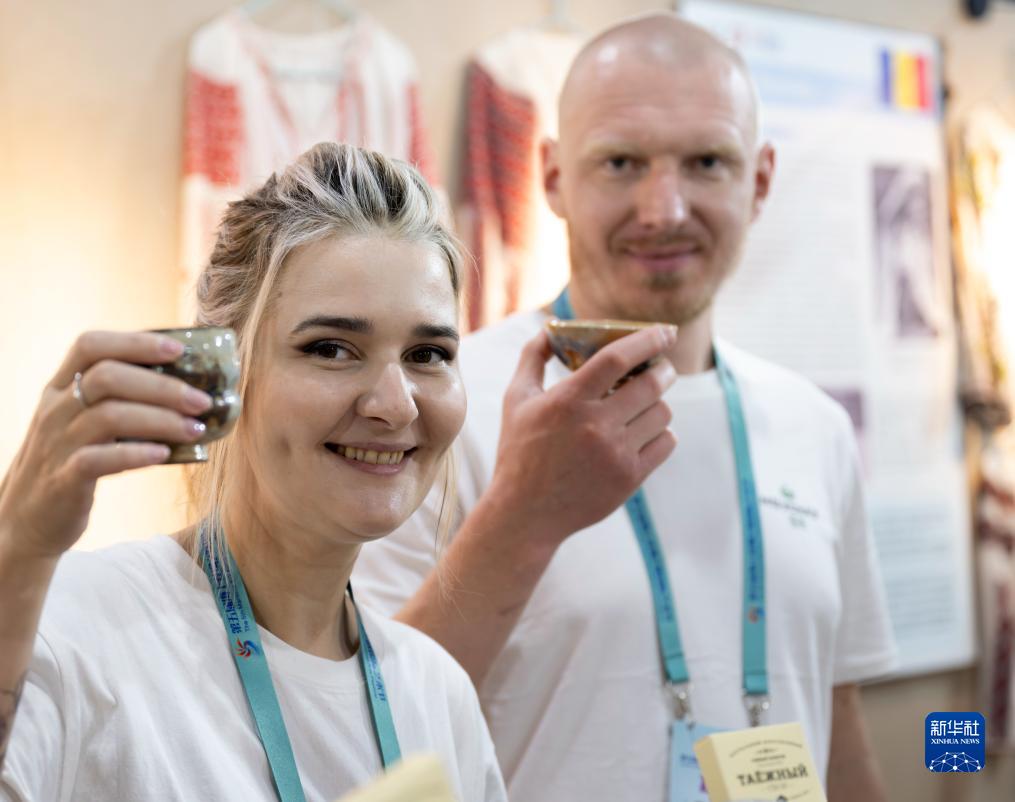 12月9日,来自俄罗斯的艺术家安娜(左)和合作伙伴介绍自己设计制作的陶瓷茶杯。