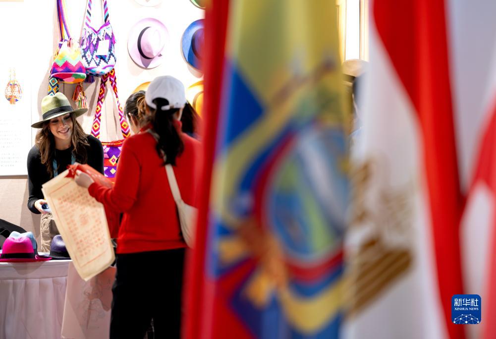 12月9日,观众在展览现场选购来自厄瓜多尔的特色编织帽。