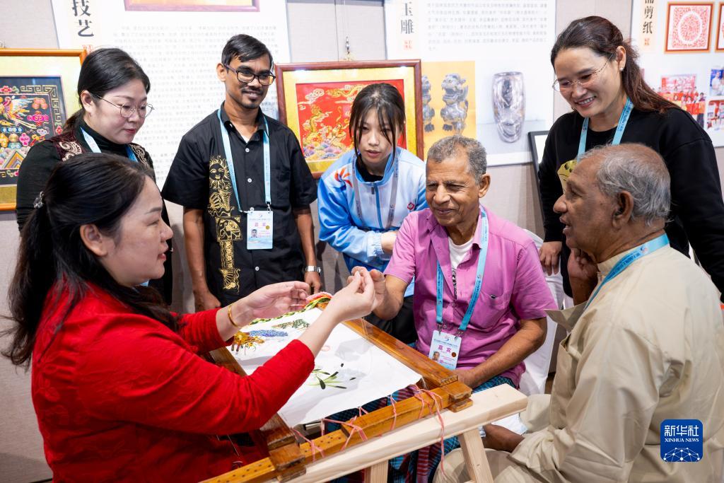 12月9日,来自斯里兰卡的艺人在体验漳绣技艺。