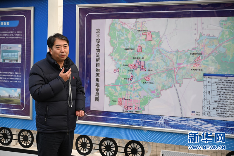 12月8日,北京市平谷区马坊镇党委书记秦海滨向媒体团介绍京平综合物流枢纽情况。新华网发 余申芳摄