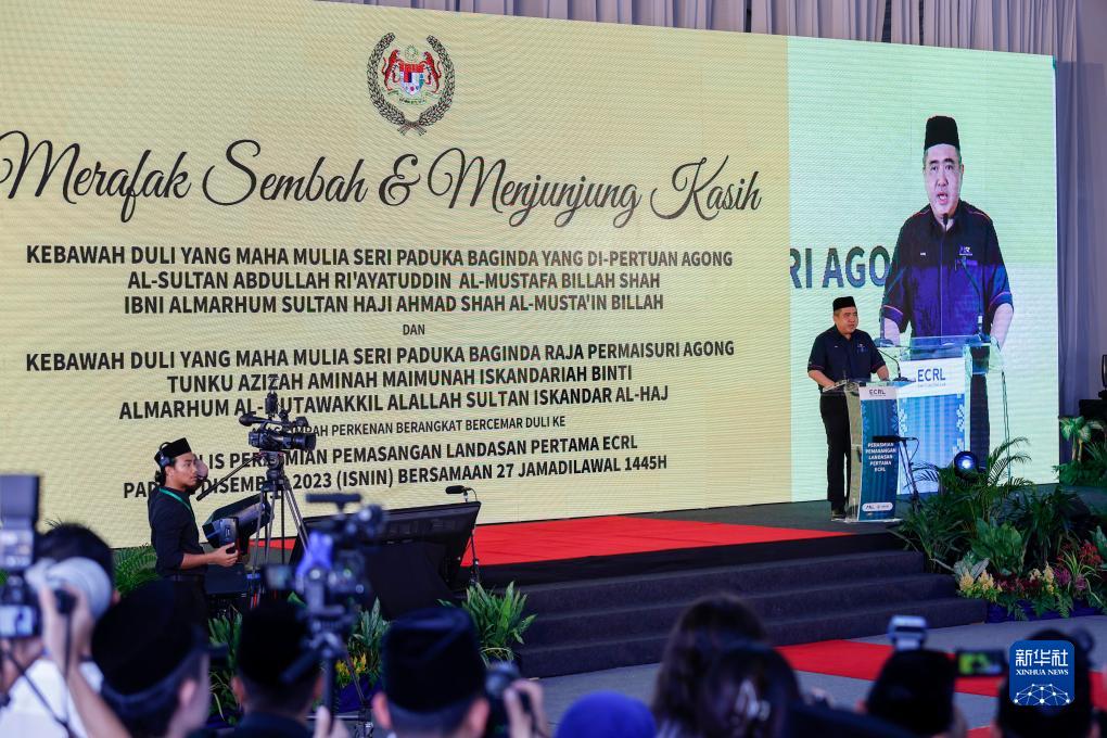 12月11日,在马来西亚彭亨州首府关丹市,马来西亚交通部长陆兆福在启动仪式上致辞。新华社发(张纹综摄)