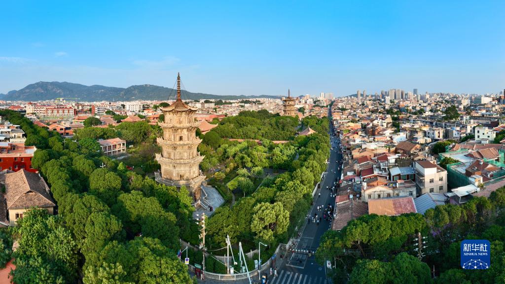 泉州开元寺及东西塔(无人机全景照片,11月7日摄)。开元寺位于泉州西街东段,始建于唐垂拱二年(686年)。东西塔是开元寺的重要文物,也是泉州古城的标志。开元寺内多元文化遗迹反映出宋元海洋贸易带给泉州的经济繁荣和文化共存特征,是体现世界海洋贸易中心多元社群的代表性遗产。