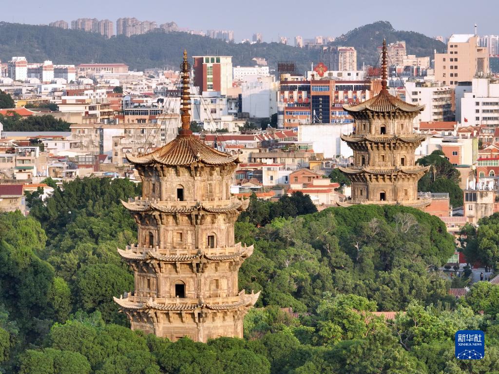 泉州开元寺及东西塔(无人机照片,11月7日摄)。开元寺位于泉州西街东段,始建于唐垂拱二年(686年)。东西塔是开元寺的重要文物,也是泉州古城的标志。开元寺内多元文化遗迹反映出宋元海洋贸易带给泉州的经济繁荣和文化共存特征,是体现世界海洋贸易中心多元社群的代表性遗产。