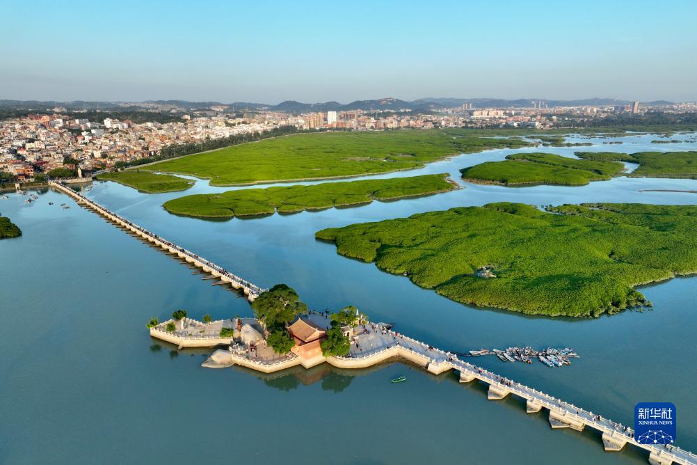 泉州洛阳桥(无人机照片,11月19日摄)。洛阳桥位于泉州市区东北部的洛阳江上,原名“万安桥”,始建于北宋皇祐五年至嘉祐四年(1053-1059年),为我国现存最早的跨海梁式大石桥,代表当时中国先进的造桥技术。